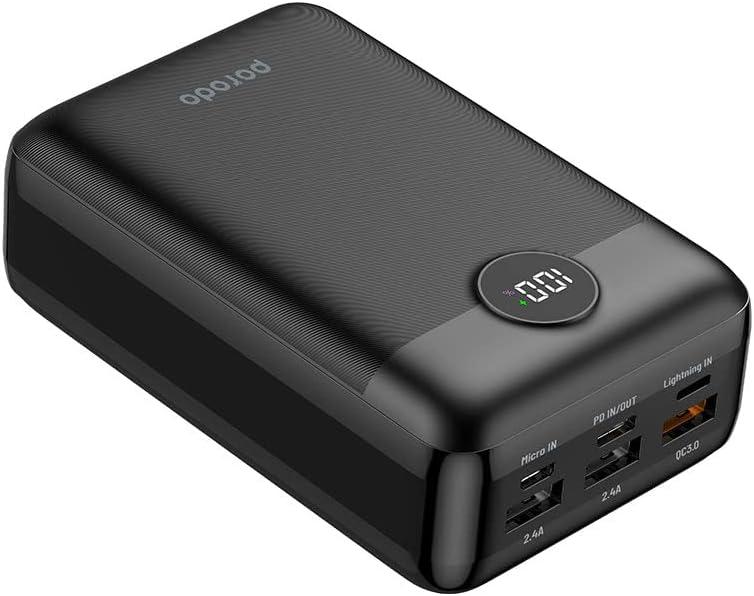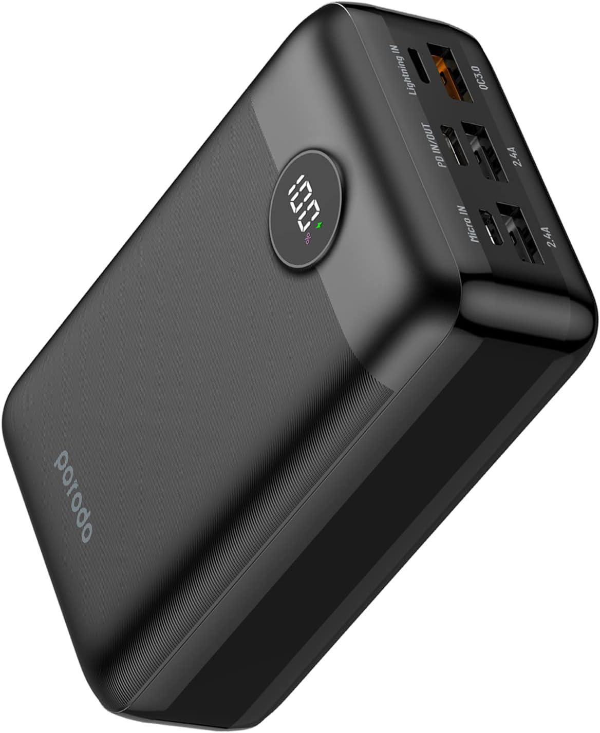 Porodo Compact Power Bank Comes with 30000mah battery capacity Which is more than enough to charge any kind of smartphone several times. You can find three USB-A ports one lightning and one micro-USB port in this product.