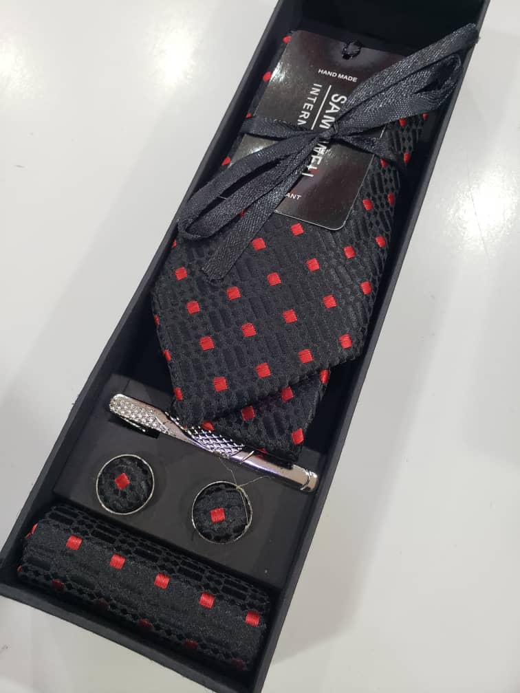Black necktie with red dots, comes with cufflns and a clip