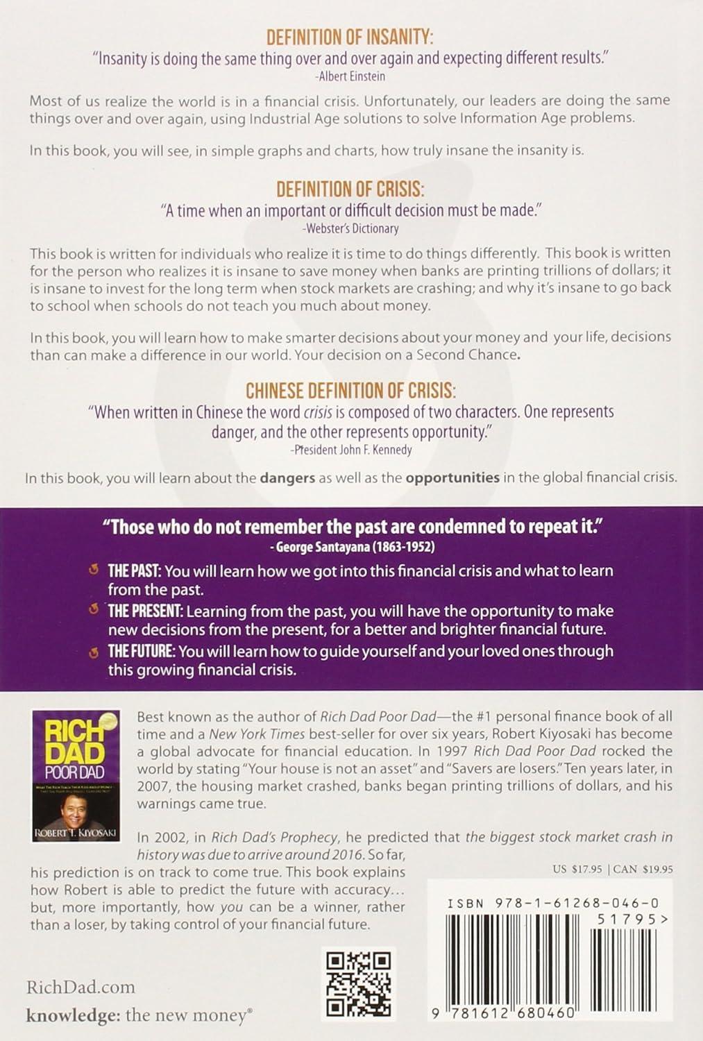 Few would argue with the fact that, on many fronts, we are a world in crisis. And there are two sides to every crisis, be it a leadership crisis, an economic crisis, an education crisis or a moral crisis. The two side to crisis are danger and opportunity. Robert Kiyosaki's new book, Second Chance. . . for Your Money and Your Life, uses the lessons from the past and a brutal assessment of the present to prepare readers to see----and seize----the future. If readers can train their minds to see what their eyes cannot, in a world that is becoming increasingly more 'invisible' and moving at a high rate of speed, they can have a second chance at creating the life they've always wanted. The global problems we face cannot be solved by the same minds and people who created them and today's world demands the ability to see the future and prepare for what lies ahead. . . prepare for the opportunities as well as the challenges. Like it or not, we are all involved in the greatest evolutionary event in human history. The Industrial Age is over and the Information Age continues to accelerate. The visible agents of change have become invisible. . . and harder to see. And the future belongs to those who can train their minds, use the past to see the future, and take the steps to create the positive change they want to see in their lives. Second Chance is a guide to understanding how the past will shape the future and how you can use Information Age tools and insights to create a fresh start. This book is a guide to facing head-on the dangers of the crises around us--and steps and tips for seizing the opportunities they present.