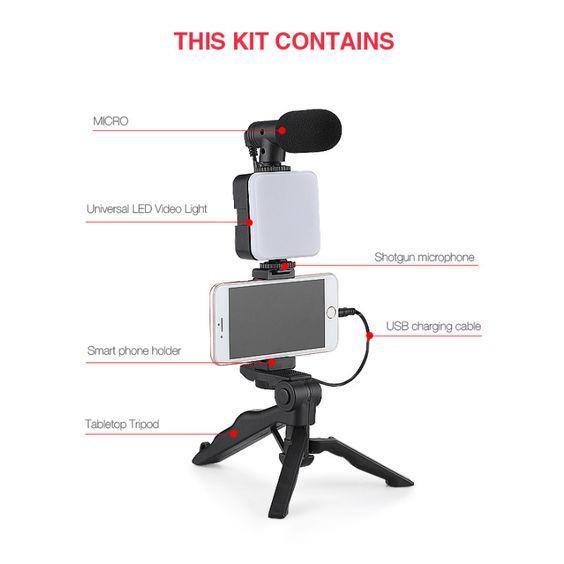 【YouTube Starter Bundle】This comprehensive kit includes a premium microphone, convenient remote control, versatile tabletop tripod with phone holder, LED light with adjustable brightness settings, rail mount bracket compatible with any 1/4" threaded accessory, and a 3.5mm adapter for both Apple and Android devices.